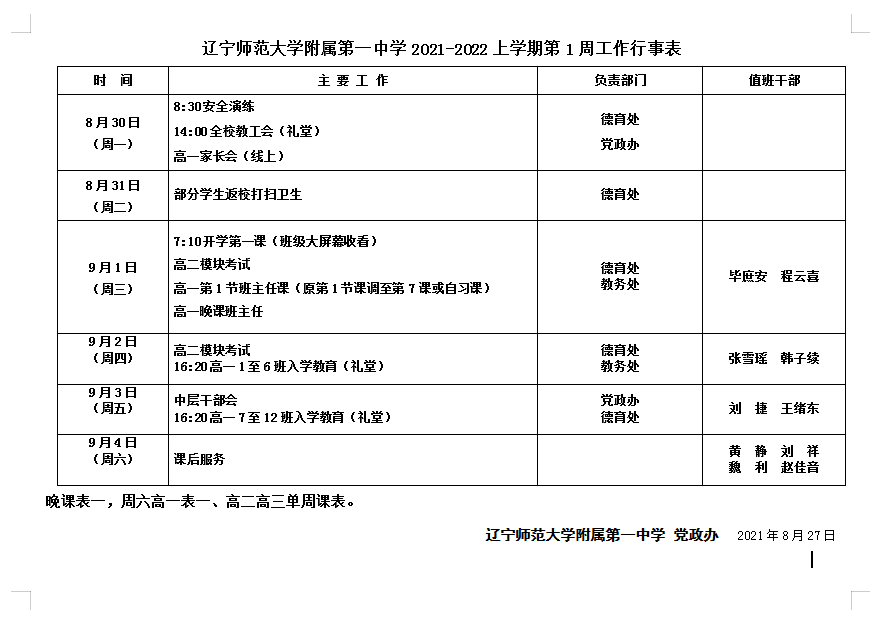 2021-2022年度上学期辽宁师范大学附属第一中学第1周行事表