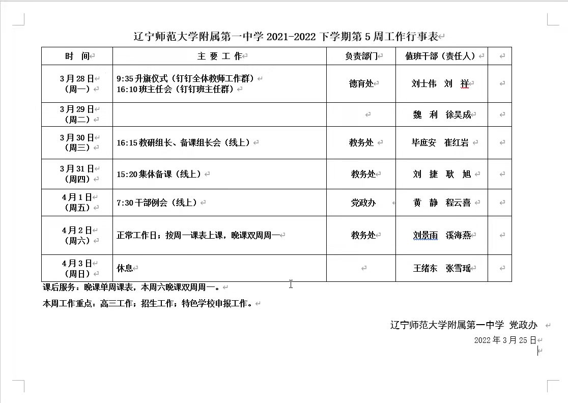 辽宁师范大学附属第一中学2021-2022下学期第5周工作行事表