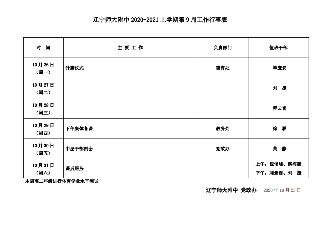 2020-2021年度上学期辽宁师范大学附属中学第9周行事表
