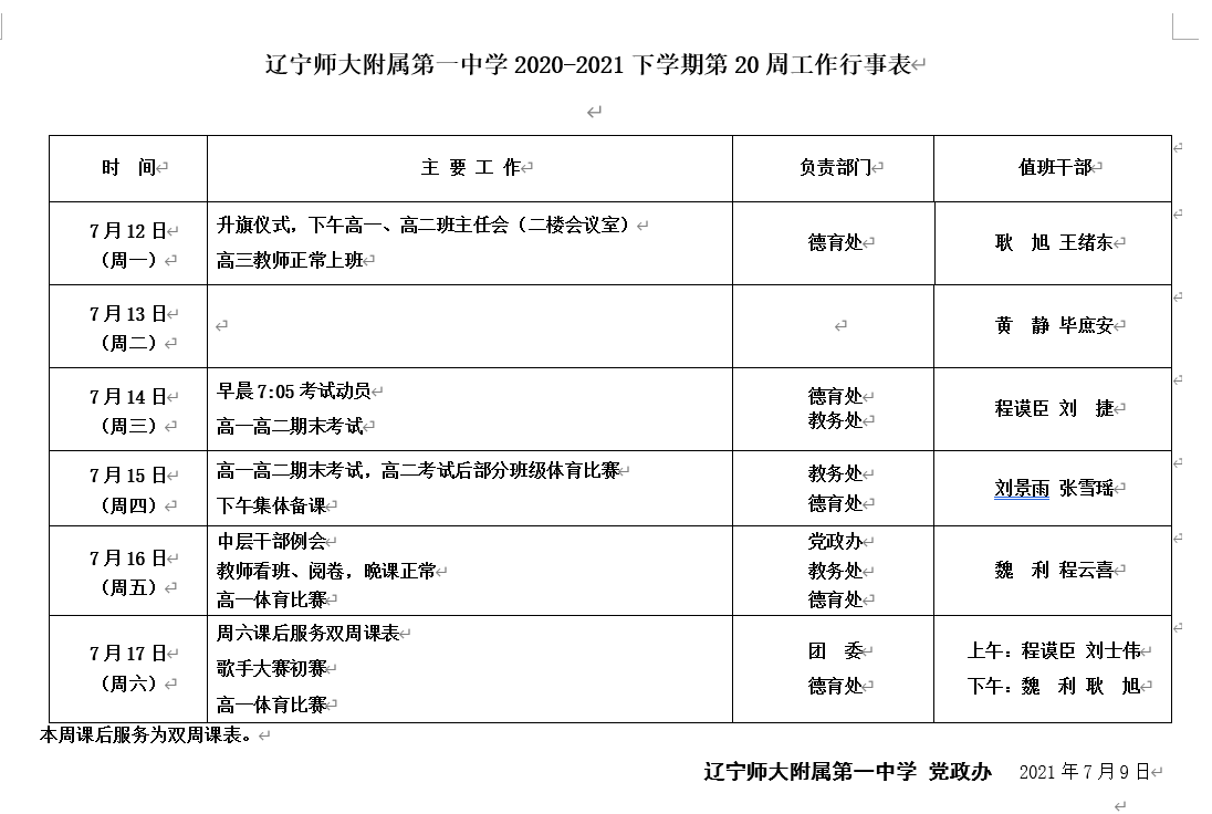 2020-2021年度下学期辽宁师范大学附属第一中学第20周行事表